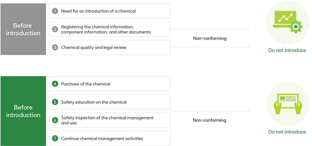 To manage high-risk chemicals, we thoroughly monitor domestic and international environmental regulations and introduce the integrated chemical management system Hi-Chems to minimize chemical-related risks.